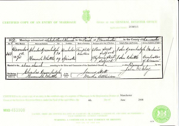 Wedding Certificate of Charles Greenhalgh & Hannah Whittle