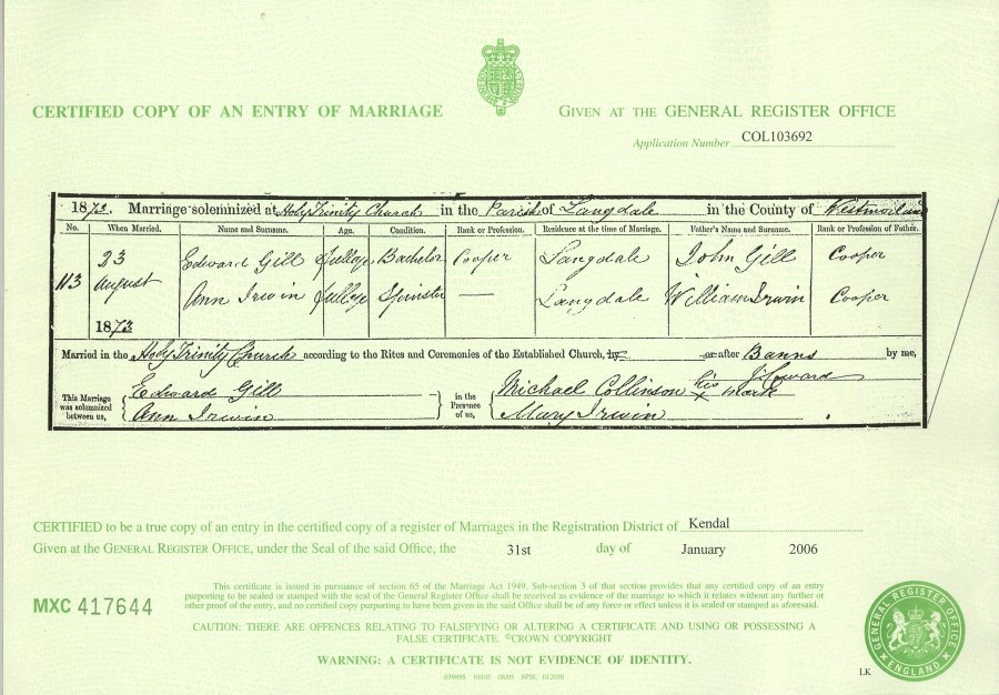 Certified copy of Marriage Certificate   -   Edward Gill and Ann Irwin