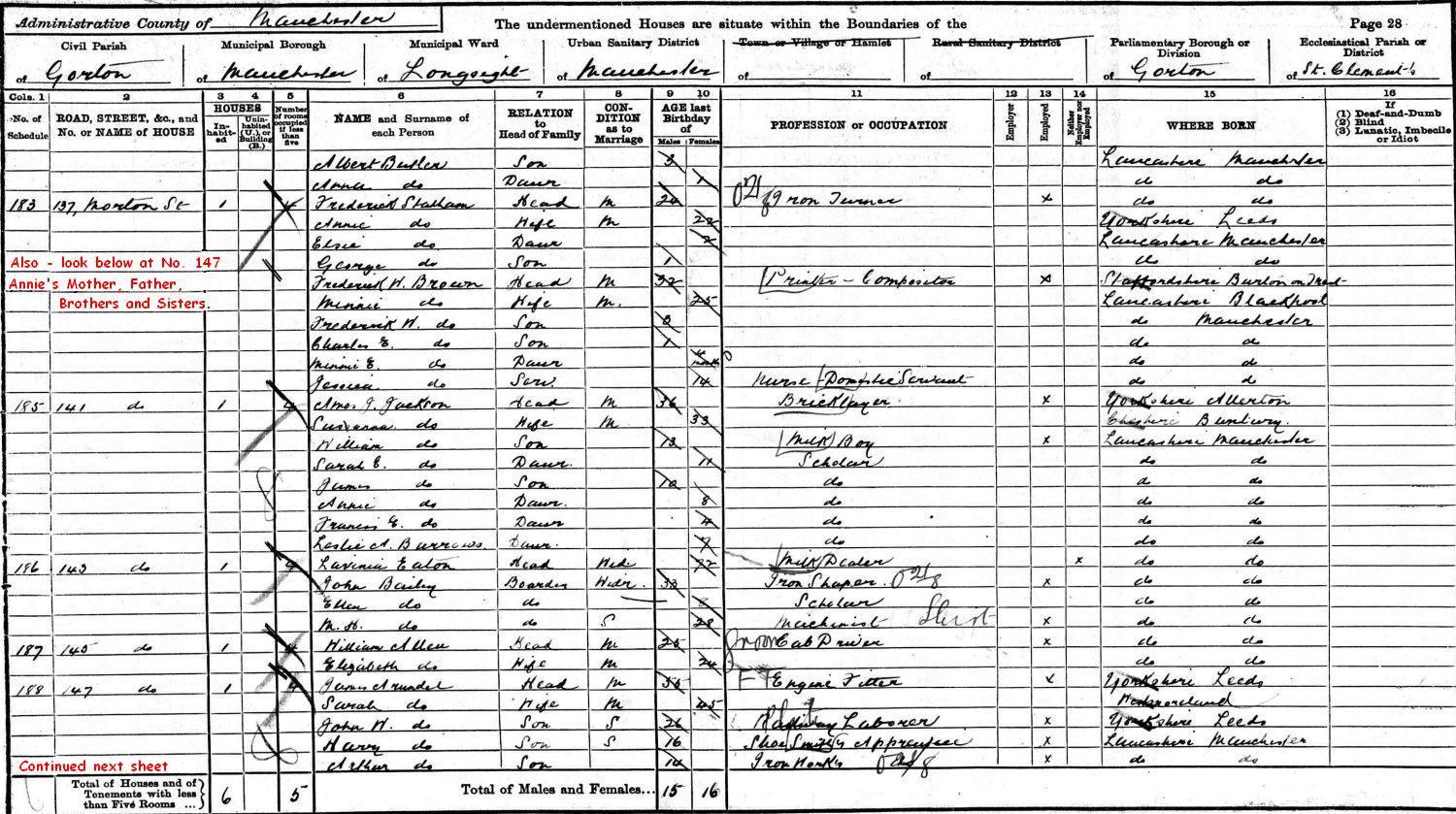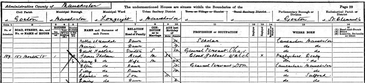 ....further down the street at No: 147 is Annie's Mother, Father and Family. Also, visiting, is Edith Walker, a relative of James' first wife's family.
