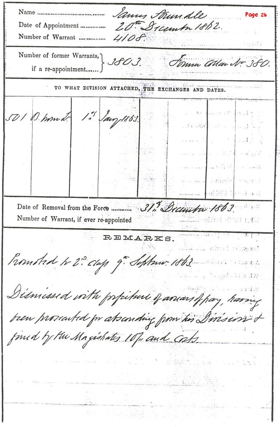 | "Dismissed with forfeiture of arrears of pay, having been prosecuted for absconding from his Division and fined by the Magistrates 10 shillings and costs. |